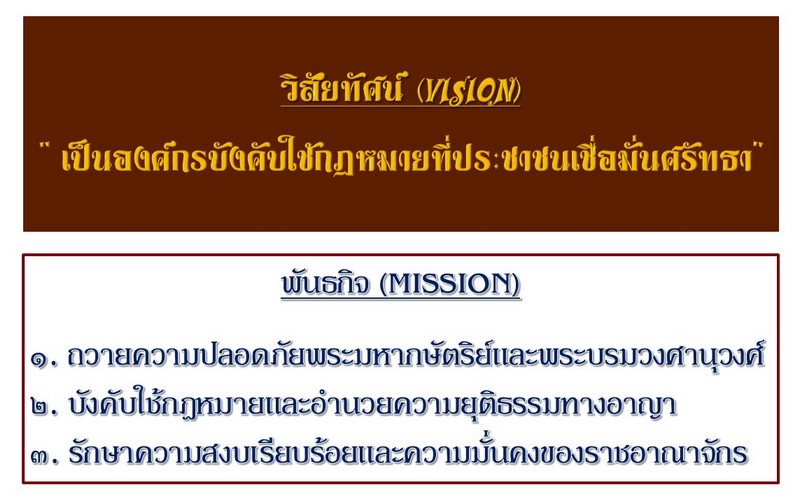 อุดมคติตำรวจ : เคารพเอื้อเฟื้อต่อหน้าที่ กรุณาปราณีต่อประชาชน อดทนต่อความเจ็บใจ ไม่หวั่นไหวต่อความยากลำบาก ไม่มักมากในลาภผล มุ่งบำเพ็ญตนให้เป็นประโยชน์ต่อประชาชน ดำรงตนในยุติธรรม กระทำการด้วยปัญญา รักษาความไม่ประมาทเสมอชีวิต