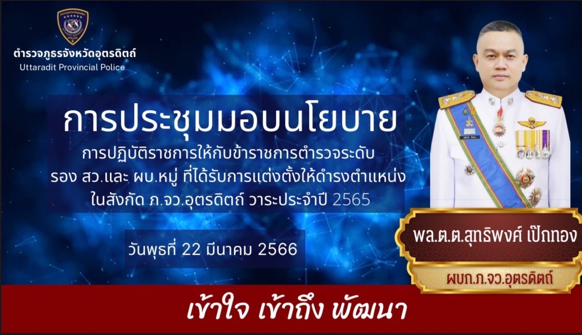 วันที่ 22 มี.ค.66 เวลา 10.00 น. พล.ต.ต.สุทธิพงศ์ เป๊กทอง ผบก.ภ.จว.อุตรดิตถ์ ประธาน พร้อมด้วย พ.ต.อ.สุเทพ ประภากรณ์ รอง ผบก.ภ.จว.อุตรดิตถ์, พ.ต.อ.สมนึก มากมี รอง ผบก.ภ.จว.อุตรดิตถ์, พ.ต.อ.สมศักดิ์ อู่ตุ้ม รอง ผบก.ภ.จว.อุตรดิตถ์ ประชุมมอบนโยบายและการรายงานตัวปฏิบัติราชการของข้าราชการตำรวจระดับ รอง สว. และ ผบ.หมู่ ที่ได้รับการแต่งตั้งดำรงตำแหน่งในสังกัด ภ.จว.อุตรดิตถ์ วาระประจำปี 2565 ณ ห้องประชุม 1 ภ.จว.อุตรดิตถ์