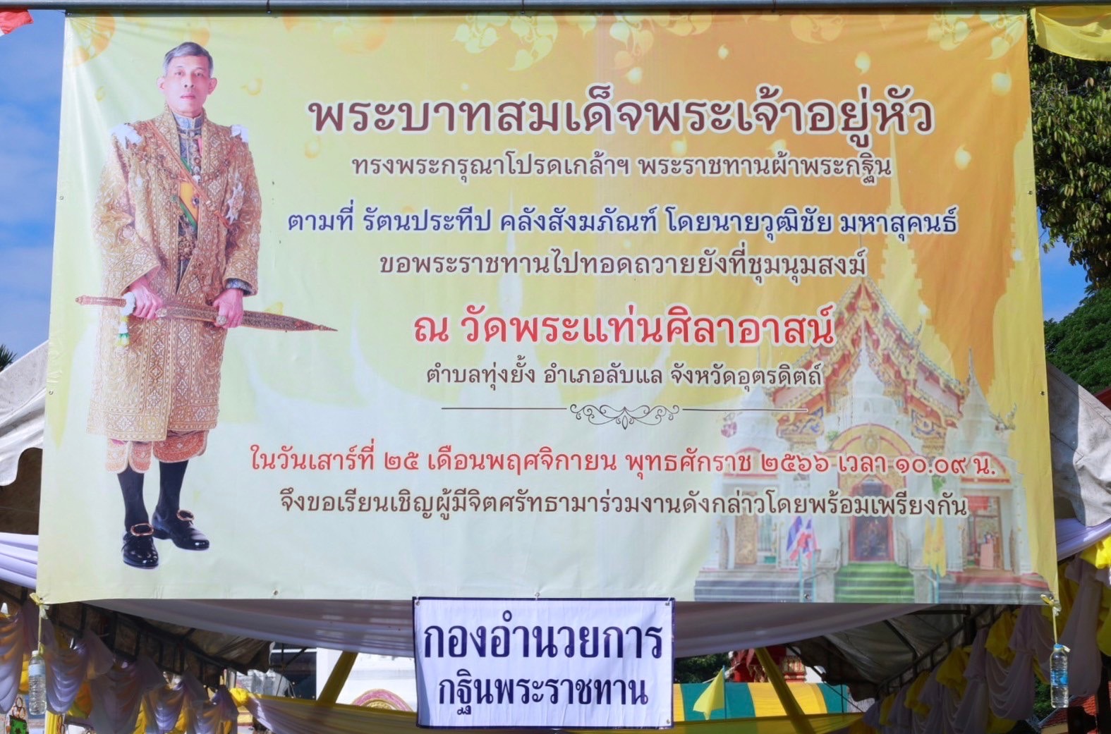 วันที่ (25 พ.ย.2566) เวลา 10.09 น. นายนพฤทธิ์ ศิริโกศล รองผู้ว่าราชการจังหวัด รักษาราชการแทนผู้ว่าราชการจังหวัดอุตรดิตถ์ พร้อมด้วย พล.ต.ต.สุทธิพงศ์ เป๊กทอง ผบก.ภ.จว.อุตรดิตถ์, พ.ต.อ.วิเชียร เพชรเสนา ผกก.สภ.ด่านแม่คำมัน และผู้บริหาร ข้าราชการ เจ้าหน้าที่ และประชาชน ร่วมพิธีถวายผ้าพระกฐินพร้อมเครื่องบริวารพระกฐิน พ.ศ.2566 โดยมี นายวุฒิชัย มหาสุคนธ์ เป็นประธานในพิธีฯ ณ วัดพระแท่นศิลาอาสน์ พระอารามหลวง ตำบลทุ่งยั้ง อำเภอลับแล จังหวัดอุตรดิตถ์