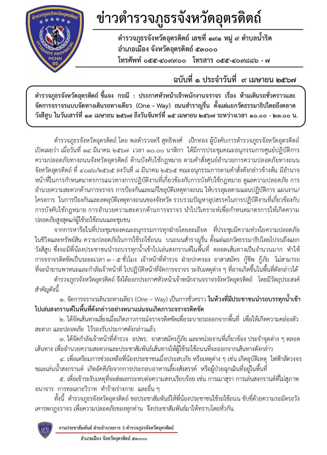 ตำรวจภูธรจังหวัดอุตรดิตถ์ ชี้แจง กรณี : ประกาศหัวหน้าเจ้าพนักงานจราจร เรื่อง ห้ามเดินรถชั่วคราวและจัดการจราจรแบบจัดทางเดินรถทางเดียว (One – Way) ถนนสำราญรื่น ตั้งแต่แยกวัดธรรมาธิปไตยถึงตลาดวังสีสูบ ในวันเสาร์ที่ 13 เมษายน 2567 ถึงวันจันทร์ที่ 15 เมษายน 2567 ระหว่างเวลา 10.00 – 23.00 น.