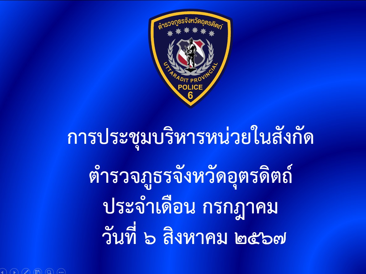 พล.ต.ต.สุทธิพงศ์ เป๊กทอง ผบก.ภ.จว.อุตรดิตถ์ เป็นประธาน พร้อมด้วย พ.ต.อ.สุเทพ ประภากรณ์ รอง ผบก.ฯ, พ.ต.อ.ธนานันท์วิชญ์ ศรีบุญเรือง รอง ผบก.ฯ, พ.ต.อ. ศิริโชติ ธเนศราภา รอง ผบก.ฯ, พ.ต.อ.สุทธิพงศ์ จันทร์พุฒ รอง ผบก.ฯ, พ.ต.อ.พีระเพชร อุบลจิตต์ รอง ผบก.ฯ , พร้อม ผกก.หน.สภ.ในสังกัด ภ.จว.อุตรดิตถ์ และหัวหน้า/ตัวแทนหน่วยงานในสังกัด ตร. ในพื้นที่จังหวัดอุตรดิตถ์ ร่วมประชุมบริหารประจำเดือนกรกฎาคม 2567 พร้อมมอบใบประกาศเกียรติคุณแก่ข้าราชการตำรวจและอาสาสมัครจราจร เพื่อเป็นการบำรุงขวัญและกำลังใจในการปฏิบัติหน้าที่ ณ ห้องประชุม 1 ภ.จว.อุตรดิตถ์ โดยมี สภ.ในสังกัดเฝ้าฟัง ณ ที่ตั้ง