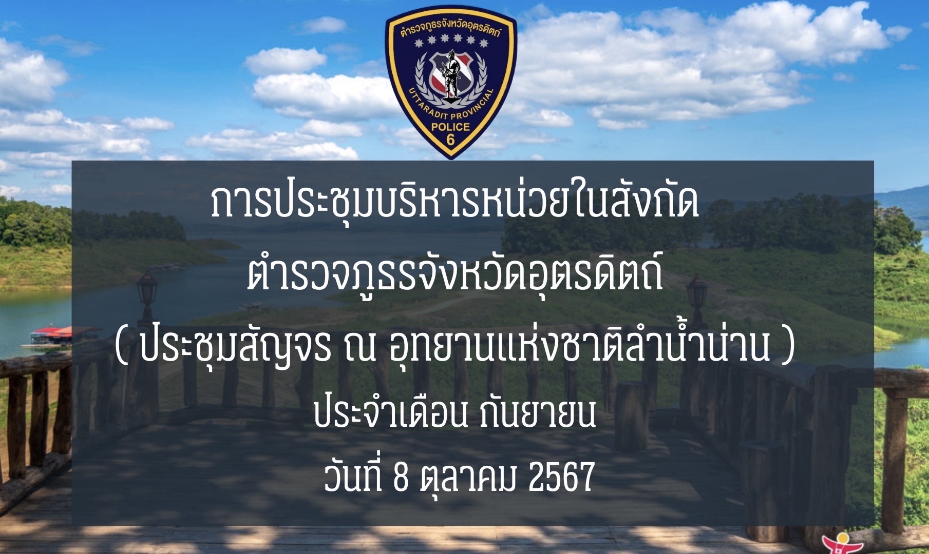 พล.ต.ต.สุทธิพงศ์ เป๊กทอง ผบก.ภ.จว.อุตรดิตถ์ ประธาน พร้อมด้วย รอง ผบก.ภ.จว.อุตรดิตถ์ ,หัวหน้า สภ.ในสังกัด และเจ้าหน้าที่ที่เกี่ยวข้อง ร่วมประชุมบริหารหน่วยงานในสังกัด ภ.จว.อุตรดิตถ์(สัญจร) ประจำเดือน กันยายน ณ ห้องประชุมอุทยานแห่งชาติลำน้ำน่าน อ.ท่าปลา จ.อุตรดิตถ์