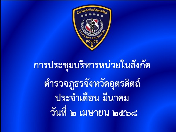 วันนี้ (2 เม.ย.68 ) เวลา 10.00 น. พล.ต.ต.สุทธิพงศ์ เป๊กทอง ผบก.ภ.จว.อุตรดิตถ์ ประธาน พ.ต.อ.สุเทพ ประภากรณ์ พ.ต.อ.ศิริโชติ ธเนศราภา พ.ต.อ.สุทธิพงศ์ จันทร์พุฒ พ.ต.อ.ลิขิตพงศ์ ศรีนาราง รอง ผบก.ภ.จว.อุตรดิตถ์ พ.ต.อ.อำนาจ รอดดอนไพร ผกก.ฝอ.ภ.จว.อุตรดิตถ์ พ.ต.อ.โสภณกรณ์ ช้างลอย ผกก.สืบสวนฯ พ.ต.อ.เสงี่ยม วรสา ผกก.(สอบสวน) กลุ่มงานสอบสวนฯ พร้อมด้วยหัวหน้าสถานีในสังกัด ภ.จว.อุตรดิตถ์ ตัวแทนหน่วยงานในสังกัด ตร. ในพื้นที่ จว.อุตรดิตถ์ และเจ้าหน้าที่ที่เกี่ยวข้องร่วมประชุมบริหารหน่วยในสังกัดภ.จว.อุตรดิตถ์ประจำ เดือนมีนาคม 2568 ณ ห้องประชุม 1 ภ.จว.อุตรดิตถ์
