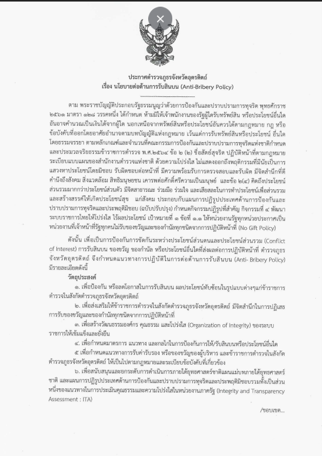 ประกาศตำรวจภูธรจังหวัดอุตรดิตถ์ เรื่อง นโยบายต่อต้านการรับสินบน (Anti-bribery Policy) 19 พฤษภาคม 2025 ข่าวประชาสัมพันธ์ 20 Views Facebook iconFacebookTwitter iconTwitterLINE iconLine Share Facebook
